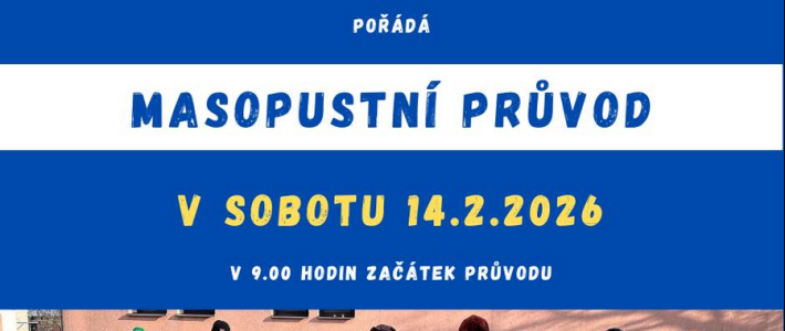 Masopustní průvod projde naší obcí v sobotu 14. února 2026. Začátek je v 9.00 hodin.
